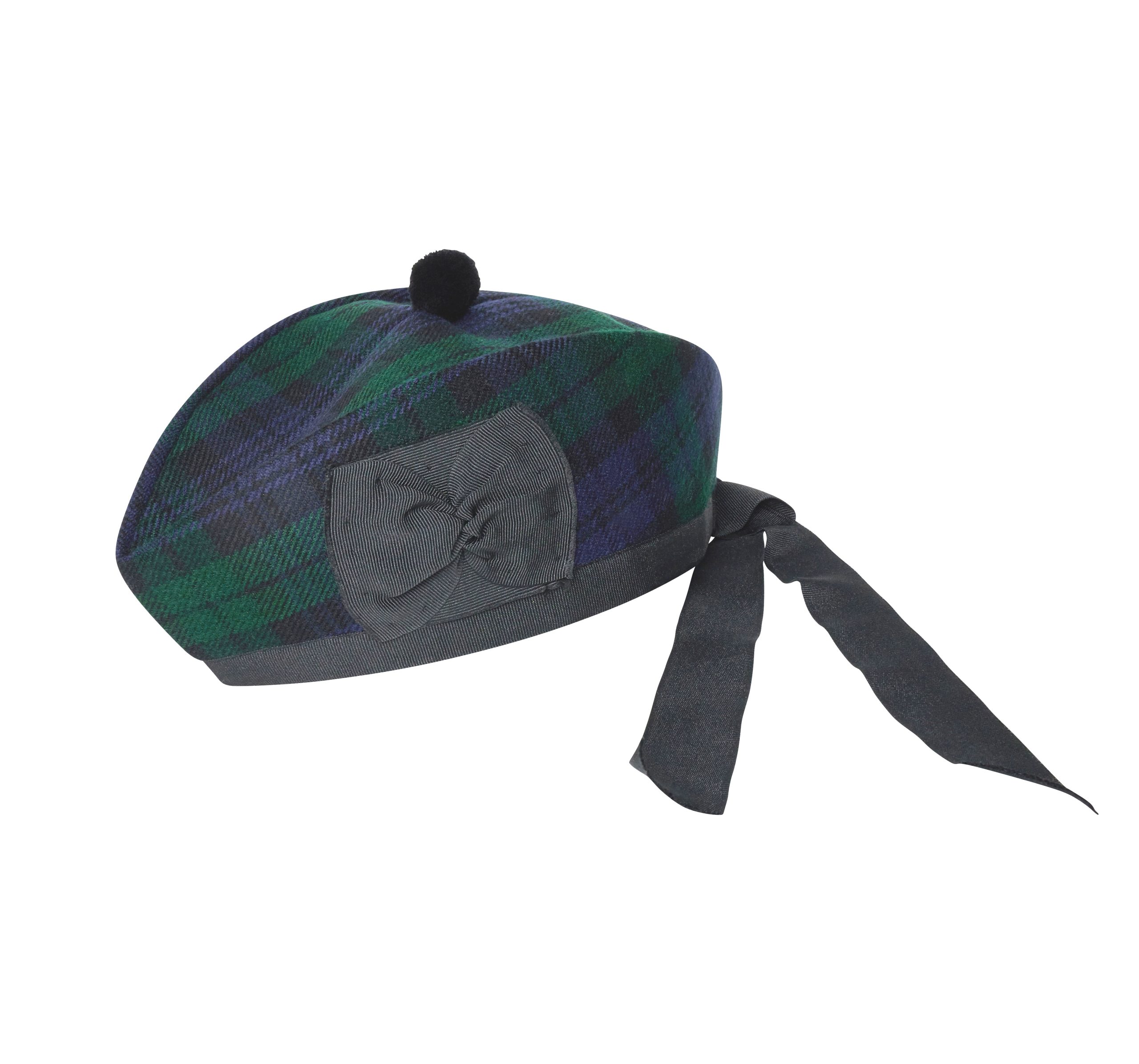 Blackwatch acrylic tartan construction, red Toorie on top Black satin bow perfect for a clan cap badge or plume Glengarry bonnet can be folded flat